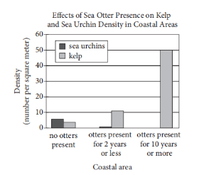 It has long been known that the sea otters (23) living along the West Coast of North America help keep kelp forests in their habitat healthy and vital. They do this by feeding on sea urchins and other herbivorous invertebrate that graze voraciously on kelp. With sea otters to keep the population of sea urchins in cheek, kelp forests can flourish. In fact, (24) two years or less of sea otters can completely eliminate sea urchins in a coastal area (see chart).