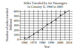 According to the line of best fit in the scatterplot above, which of the following best approximates the year in which the number of miles traveled by air passengers in Country X was estimated to be 550 billion?