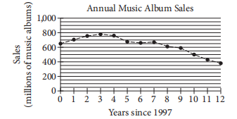 The graph below shows the total number of music album sales, in millions, each year from 1997 through 2009.