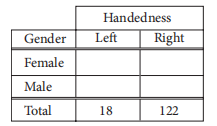 The incomplete table above summarizes the number of left-handed students and right-handed students by gender for the eighth-grade students at Keisel Middle School. There are 5 times as many right-handed female students as there are left-handed female students, and there are 9 times as many right-handed male students as there are left-handed male students. If there is a total of 18 left-handed students and 122 right-handed students in the school, which of the following is closest to the probability that a right-handed student selected at random is female? (Note: Assume that none of the eighth-grade students are both right-handed and left-handed.)