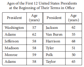 The table above lists the ages of the first 12 United States presidents when they began their terms in office. According to the table, what was the mean age, in years, of these presidents at the beginning of their terms? (Round your answer to the nearest tenth.)