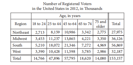 The table above shows the number of registered voters in 2012, in thousands, in four geographic regions and five age groups. Based on the table, if a registered voter who was 18 to 44 years old in 2012 is chosen at random, which of the following is closest to the probability that the registered voter was from the Midwest region?