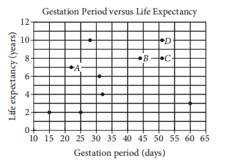 A curator at a wildlife society created the scatterplot above to examine the relationship between the gestation period and life expectancy of 10 species of animals.