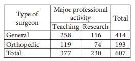 In a survey, 607 general surgeons and orthopedic surgeons indicated their major professional activity. The results are summarized in the table above. If one of the surgeons is selected at random, which of the following is closest to the probability that the selected surgeon is an orthopedic surgeon whose indicated professional activity is research?