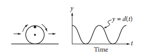 The figure on the left above shows a wheel with a mark on its rim. The wheel is rolling on the ground at a constant rate along a level straight path from a starting point to an ending point. The graph of