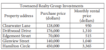 The Townsend Realty Group invested in the five different properties listed in the table above. The table shows the amount, in dollars, the company paid for each property and the corresponding monthly rental price, in dollars, the company charges for the property at each of the five locations.