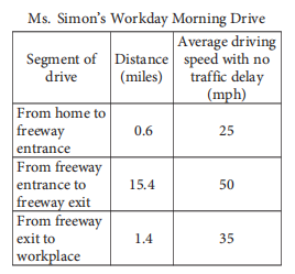 Ms. Simon drives her car from her home to her workplace every workday morning. The table above shows the distance, in miles, and her average driving speed, in miles per hour (mph), when there is no traffic delay, for each segment of her drive.