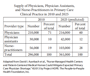 Increasingly, PAs and other such medical practitioners have become a critical complement to physicians. A 2013 RAND Corporation report estimates that while the number of primary care physicians will increase slowly from 2010 to 2025, the number of physician assistants and nurse-practitioners in primary care will grow at much faster rates. (32) Both by merit and from necessity, PAs are likely to greet more (33) patience than ever before.
