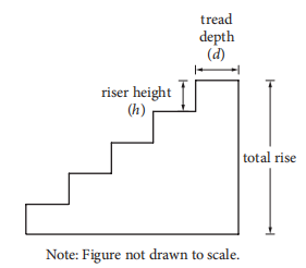 , where h is the riser height, in inches, and d is the tread depth, in inches. For any given stairway, the riser heights are the same and the tread depths are the same for all steps in that stairway. The number of steps in a stairway is the number of its risers. For example, there are 5 steps in the stairway in the figure above. The total rise of a stairway is the sum of the riser heights as shown in the figure.17