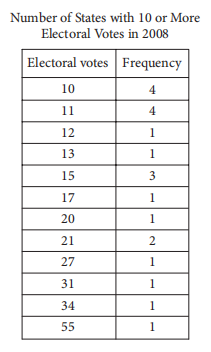 In 2008, there were 21 states with 10 or more electoral votes, as shown in the table above. Based on the table, what was the median number of electoral votes for the 21 states?