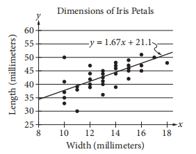 The scatterplot above shows data collected on the lengths and widths of Iris setosa petals. A line of best fit for the data is also shown. Based on the line of best fit, if the width of an Iris setosa petal is 19 millimeters, what is the predicted length, in millimeters, of the petal?