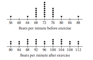 The 22 students in a health class conducted an experiment in which they each recorded their pulse rates, in beats per minute, before and after completing a light exercise routine. The dot plots below display the results.