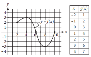 The complete graph of the function f and a table of values for the function g are shown above. The maximum value of f is k. What is the value of g(k)?
