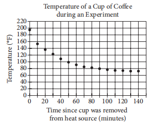 In an experiment, a heated cup of coffee is removed from a heat source, and the cup of coffee is then left in a room that is kept at a constant temperature. The graph above shows the temperature, in degrees Fahrenheit (°F), of the coffee immediately after being removed from the heat source and at 10-minute intervals thereafter.