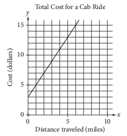The line graphed in the xy-plane below models the total cost, in dollars, for a cab ride, y, in a certain city during nonpeak hours based on the number of miles traveled, x.