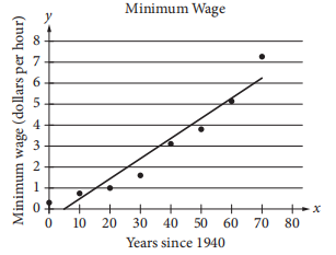 The scatterplot above shows the federal-mandated minimum wage every 10 years between 1940 and 2010. A line of best fit is shown, and its equation is y = 0.096x - 0.488. What does the line of best fit predict about the increase in the minimum wage over the 70-year period?