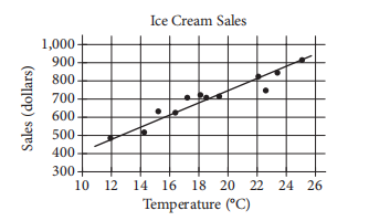 The scatterplot above shows a company’s ice cream sales d, in dollars, and the high temperature t, in degrees Celsius (°C), on 12 different days. A line of best fit for the data is also shown. Which of the following could be an equation of the line of best fit?