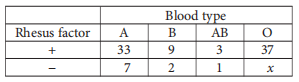Human blood can be classified into four common blood types—A, B, AB, and O. It is also characterized by the presence (+) or absence (–) of the rhesus factor. The table above shows the distribution of blood type and rhesus factor for a group of people. If one of these people who is rhesus negative (–) is chosen at random, the probability that the person has blood type B is