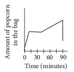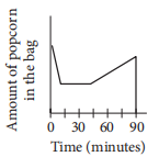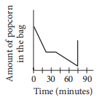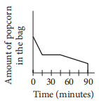 Jake buys a bag of popcorn at a movie theater. He eats half of the popcorn during the 15 minutes of previews. After eating half of the popcorn, he stops eating for the next 30 minutes. Then he gradually eats the popcorn until he accidentally spills all of the remaining popcorn. Which of the following graphs could represent the situation?