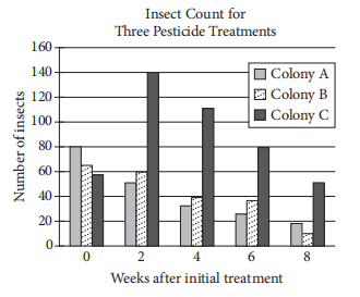 What are all values of x that satisfy the given equation? Three colonies of insects were each treated with a different pesticide over an 8-week period to test the effectiveness of the three pesticides. Colonies A, B, and C were treated with Pesticides A, B, and C, respectively. Each pesticide was applied every 2 weeks to one of the three colonies over the 8-week period. The bar graph above shows the insect counts for each of the three colonies 0, 2, 4, 6, and 8 weeks after the initial treatment.