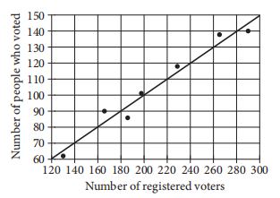 The scatterplot above shows the number of registered voters, x, and the number of people who voted in the last election, y, for seven districts in a town. A line of best fit for the data is also shown. Which of the following could be the equation of the line of best fit?