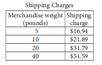The table above shows shipping charges for an online retailer that sells sporting goods. There is a linear relationship between the shipping charge and the weight of the merchandise. Which function can be used to determine the total shipping charge f(x), in dollars, for an order with a merchandise weight of x pounds?