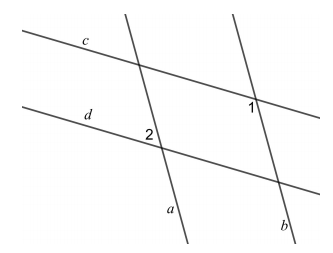 In the figure above, lines a and b are parallel and lines c and d are parallel. If the measure of ∠2 is 40°, what is the measure of ∠1?