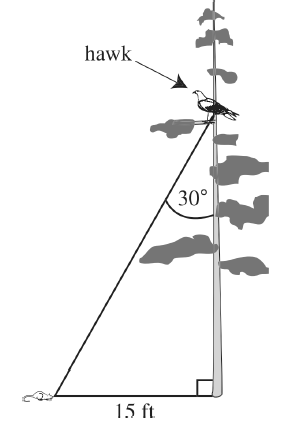 26. A hawk sitting on a tree branch spots a mouse on the ground 15 feet from the base of the tree. The hawk swoops down toward the mouse at an angle of 30 degrees. What is the distance from the tree branch to the mouse?