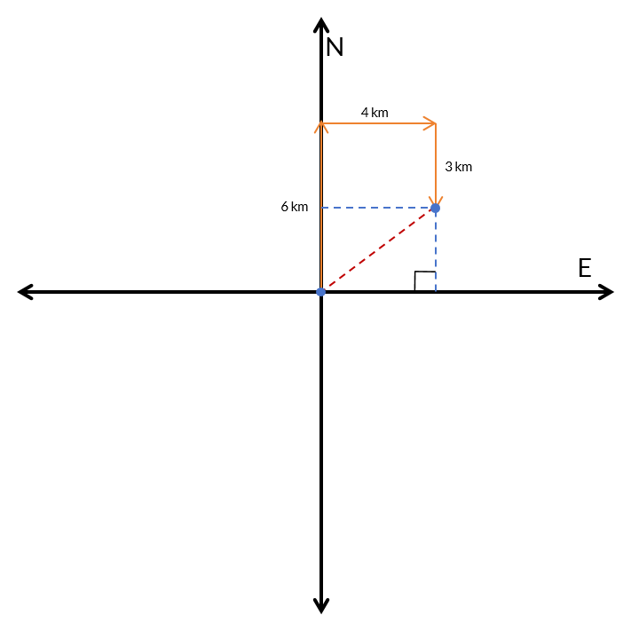 a right triangle with legs of 3 kilometers (north) and 4 kilometers (east), the