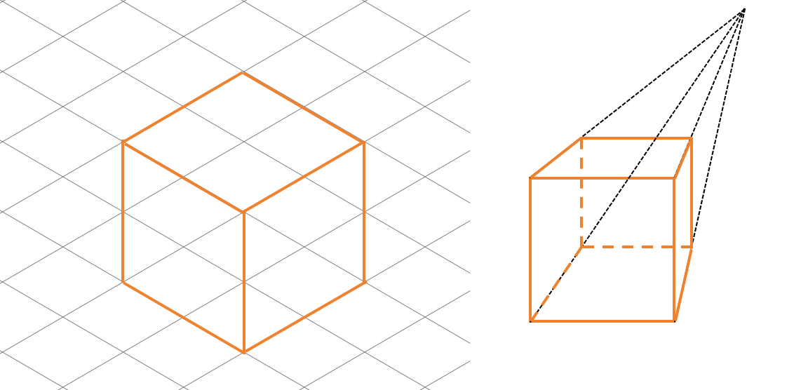 If we compare an isometric drawing of a cube with a one-point perspective drawing of the same cube, ____.