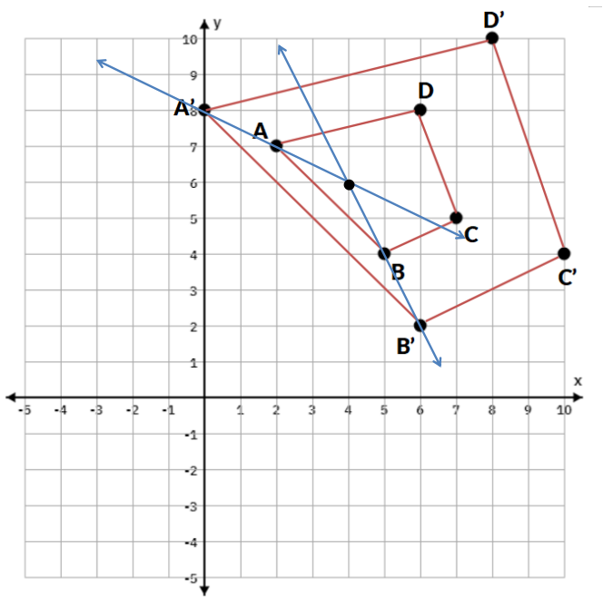 In the graph, quadrilateral A'B'C'D' is the image of ABCD after a dilation. What are the scale factor and center of the dilation?