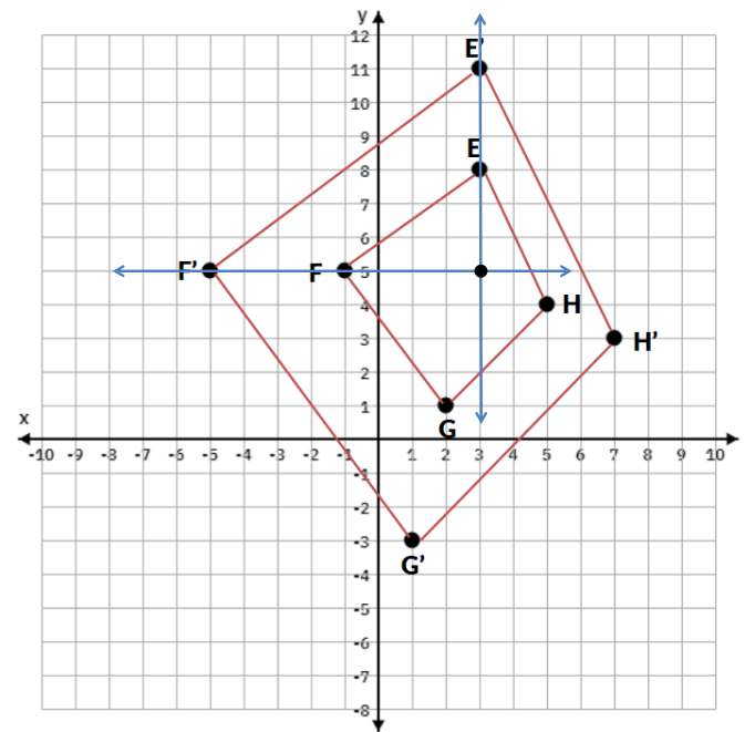 In the graph, quadrilateral E'F'G'H' is the image of EFGH after a dilation. What are the scale factor and center of the dilation?